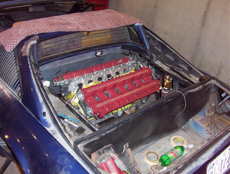 Fast forward a couple more years to the current project. I pulled the V8 out and bought myself a very tired 4.8L V12 from a Ferrari 400i. Then I got a set of 4 valve heads from a Testarossa saying “I’ll bet they fit” on the 400 block (which is a 2V engine). I’ve spent the past year and a half force fitting the 400 block onto the 308 transaxle and the TR heads onto the 400 block….it turned out this was a very bad idea and a just plain stupid amount of work but I’m getting there. If you are interesting in all the gory details I’ve got losts of pictures in a VERY long thread on the Ferrari forum, (they make you register to see the pics but its free and they don’t send spam). It should make about 750-800 crank hp at about 9000 rpm when complete