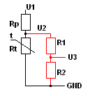 Rt, R1 и R2 образуют сопротивление R = ((R1 + R2) * Rt) /((R1 + R2) + Rt);