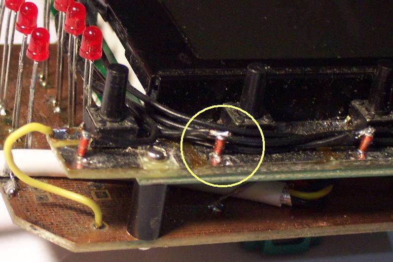 Кнопки припаял на узкой платке с прорезанными площадками. На ней же припаяны диоды D0 и проводами соединены с контактами индикатора. Общий провод кнопок - проводом на плату на точку Р2.