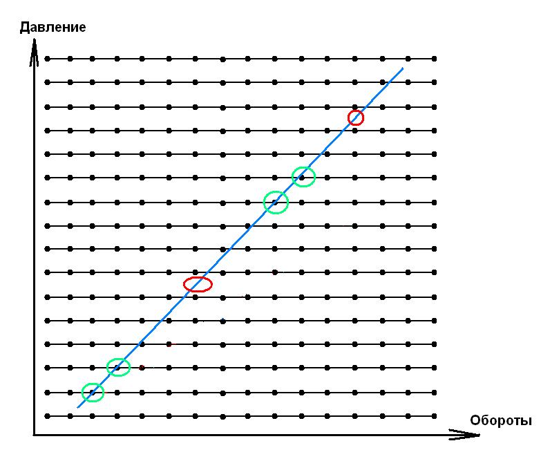 - красными кружками помечены рабочие точки двигателя, которые находятся "по давлению" между двумя кривыми. Здесь изменять УОЗ нельзя - не совпадает с точками таблицы, которые мы и изменяем.