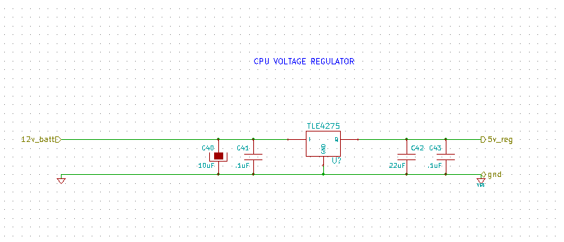 I seem to recall that .7 to .6 amps isn't quite enough for our needs when run fully loaded. I seem to recall our design spec is 1 amp min. However I don't think we've actually measured that, so less than 1 amp might work. 5 V ± 2% is a fair bit of wonder. Appears that's mostly temperature wonder. This is to much for us, as the A/D's reference that voltage, and it would induce 2% error in our calculations, for each sensor. The compounding tolerances would make for a buggy system. Also it appears to be a linear regulator, so it will get hot, and you'll have to deal with it thermally via heat sink. Remember the power drop will be around (13.4 - 5)*1 = 8.4 watts, while delivering 5 watts to the PCB. So a total power draw of 12.4 watt's to be dissipated by the board. The efficiency of a linear for this application is (5/12.4)*100= 40% efficient. The switching is upwards of 80% efficient, so total power dissipated by the board is around 6.25 watts to deliver 5 watts of power. Dropping that additional 6.15 watts is handy, as we have several other heat sources like the injector drivers and ignition drivers.