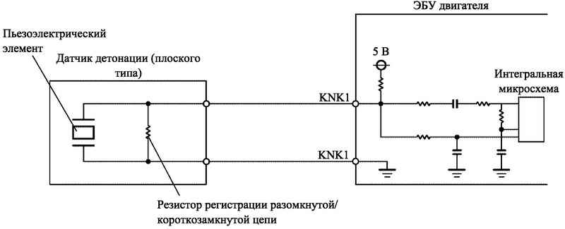 Если зажигание включено, резистор регистрации разомкнутой/короткозамкнутой цепи датчика детонации и резистор в ЭБУ двигателя поддерживают постоянное напряжение на клемме KNK1. Напряжение на клемме постоянно контролирует интегральная микросхема ЭБУ двигателя. Если цепь между датчиком детонации и ЭБУ двигателя размыкается или замыкается накоротко, напряжение на клемме KNK1 изменяется, и ЭБУ двигателя регистрирует размыкание/короткое замыкание цепи, записывая при этом в память электронный код DTC P0325.