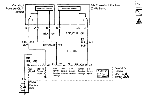 The 24X crankshaft position sensor contains a Hall- effect switch. The magnet and Hall-effect switch are separated by an air gap. A Hall-effect switch reacts like a solid state switch, grounding a low current signal voltage when a magnetic field is present. When the magnetic field is shielded from the switch by a piece of steel placed in the air gap between the magnet and the switch, the signal voltage is not grounded. If the piece of steel (called an interrupter) is repeatedly moved in and out of the air gap, the signal voltage will appear to go on-off, on-off, on-off. Compared to a conventional mechanical distributor, this on-off signal is similar to the signal that a set of breaker points in the distributor would generate as the distributor shaft turned and the points opened and closed.
