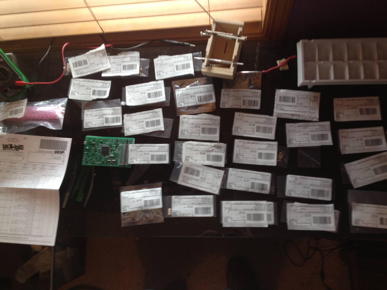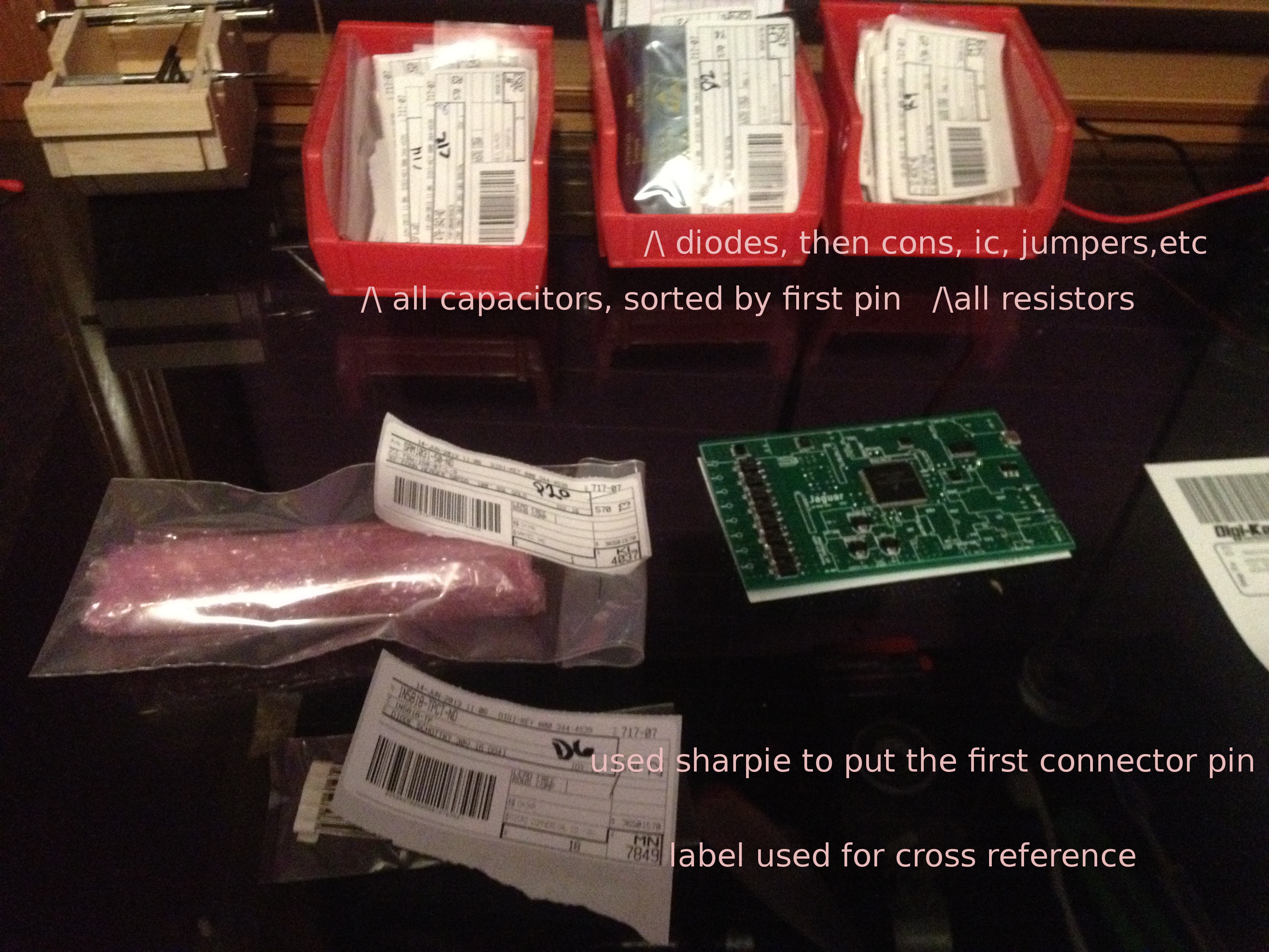 I've also received the package from Andy, and just now the components from Digi-key. No disrespect Andy, I just wanted to make sure I got all of them easy to sort, and it's easier to claim business expense from Digi-key than Drunkards Pike. Here's the jaguar sitting in front of the unwrapped package Here I've shown just how many sub-components are required to complete the project. One by one I added the reference number in the bottom corner of the packaging onto the BOM worksheet, validating part numbers and quantities. I used a sharpie to mark the package with the first reference the part is used. Here's a picture of the sorted materials.