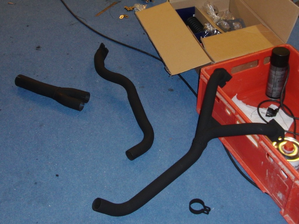 - Derusted the exhaust manifold with "Fertan" and a wire brush under running water; removed the the already defunct O2 sensor nut (-> welded shut by pre-owner) and patched up the hole; then thoroughly heated up the parts with a heat gun; painted them with VHT GS102 heat resistent paint; heated up the parts again (two times) until smoke ceased coming off -> Hopefully burnt in. (Note: Just hand that crap over to sandblasting next time, then paint) - Milled away parts of the intake manifold so that it doesn't collide with the valve cover. Also milled down the screw seats to match the thickness of the header flanges.