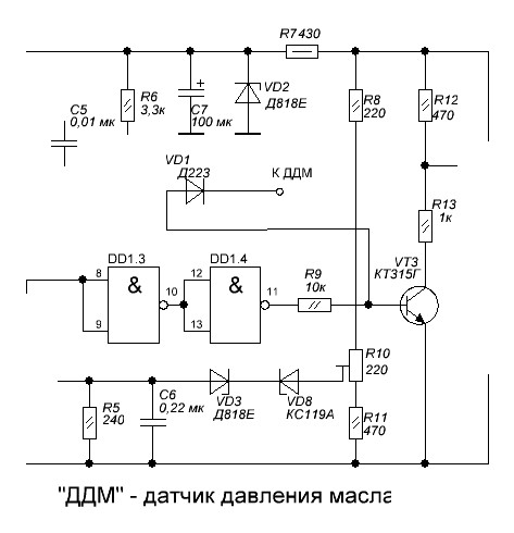 (C базы VT3 вниз диод, на плате есть пятаки, нет обозначения). Коммутируя "базой на корпус" удалось сэкономить одно сопротивление - R6 по верхней схеме).
